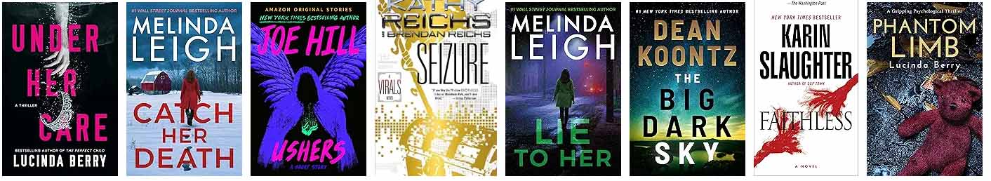 Screenshot from amazon.com showing book covers for Under Her Care by Lucinda Berry, Catch Her Death by Melinda Leigh, Ushers by Joe Hill, Seizure by Kathy Reichs and Brendan Reichs, Lie to Her by Melinda Leigh, The Big Dark Sky by Dean Koontz, Faithless by Karin Slaughter, and Phantom Limb by Lucinda Berry.