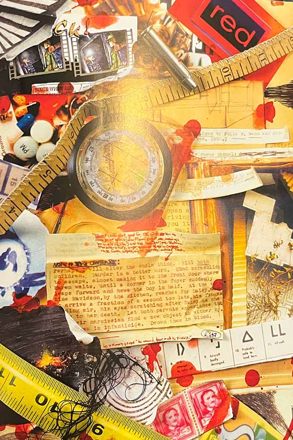 At first glance the cover of House of Leaves, designed by Eric Fuentiecilla, is deceptively simple. It appears as a block page with a compass rose at the center, title above, author below. The very top announces that this is “The Remastered Full-Color Edition”, the bottom “a novel.” Looking again, you notice a glossy black diagram that looks a little like a building diagram with a spiral staircase in the center. The spiral, a Fibonacci sequence, terminates at the center of the compass rose. Simple as it is, this design echoes the haunting content described in these pages. The cover more relevant after reading the book than before. The front flap of this edition is also shorter than the next page – a full color collage of seemingly disparate items – easter eggs if you care to know – and sets the tone for the stories within.