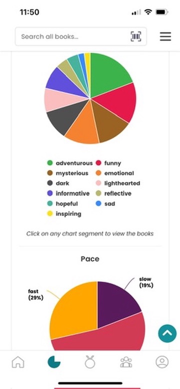 - 🛠️ Functions / Features: Mood & pacing tracking, detailed charts, strong tagging system, community reading challenges. Goodreads import.