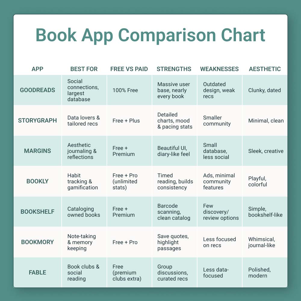 - 😕 Weaknesses: Smaller community, less social engagement than Goodreads.